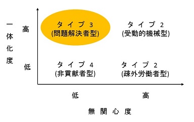 この無関心度を横軸、一体化度を縦軸にとったグラフをI I図(I-I chart; Identification-Indifference chart)と呼び、これにメンバーおよび組織をプロットすることで、活性化度の比較を行う手法を開発した。無関心度の高低と一体化度の高低の組み合わせから、図1のような四つのタイプに類型化して考えることができる。