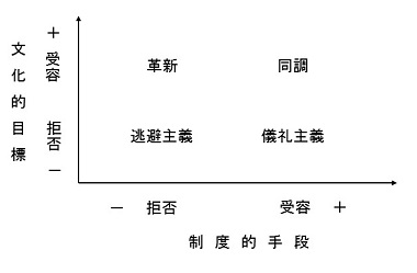 (出所) 高橋(1995, p.150, 図4)が、Merton (1949, p.236)から作成したもの。ただし、この整理の仕方だと5番目の類型「反抗」を表示することは難しい。