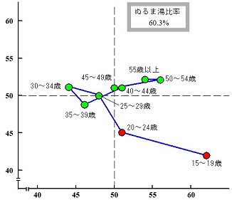 図3. 湯かげん図(JPC1987調査; 破線は平均値)