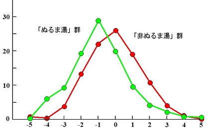 別の根拠もある。図4の回帰直線、決定係数を計算するに当たっては、体感温度5の人を計算に入れてない。それは、あきらかにこの点が直線から乖離しているという理由からだけではない。実は、JPC調査では、ほぼ1万人も調べているのに、体感温度が5の人(多分、熱いと感じているはず)はたったの9人、わずか0.1%しかいなかったのである。体感温度4の人も94人しかいない。体感温度4と体感温度5の人を足しても103人にしかならず、全体の1.0%しかいなかったことになる。回帰直線からややふらついている体感温度2以上の人は、全部合計しても991人、9.4%しかいない。体感温度が高い人は非常に少ないことになる。これは測定尺度の問題ではなく、体感温度が高いと、熱くて入っていられない熱湯状態だということが、JPC調査以外の調査からも次第にわかってきた。