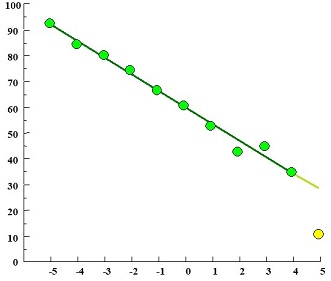 この改良版体感温度測定尺度を用いて、1990〜2000年の11年間に、のべ10,536人のデータが集められたが、その結果は、表3、図4のようになった。体感温度が-5のときに92%の人がぬるま湯だと答えて、体感温度が0のときに59%の人がぬるま湯だと答えている。体感温度仮説通り、体感温度が上がるとぬるま湯比率が下がるという驚くほどきれいな直線的な関係が現れていることがわかる。体感温度5を除いた回帰直線は