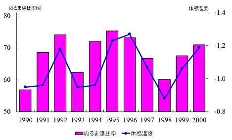 図8. ぬるま湯比率の推移と体感温度(JPC1990〜2000調査)
