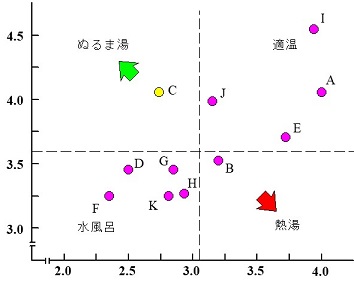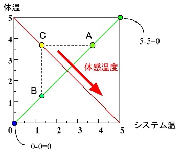 さらに「湯かげん図」から、体感温度仮説が正しければ、「ぬるま湯」と感じることは必ずしも悪いことではないことも分かる。図5で左下隅と右上隅を結んだ45度の傾きの体感温度0の直線上に点Aと点Bがある。どちらも「適温」と感じているはずである。それに対して「ぬるま湯」領域に点Cがあり、体感温度がマイナスになっているこの点では「ぬるま湯」と感じているはずである。点Aは点Cと比べると、体温は同じだがシステム温が高いので、点Aの方がより望ましい状態であるといっていい。しかし同じ体感温度0の点でも点Bと比べれば、点Cの方がシステム温は同じでも、体温がより高いので望ましいのではないだろうか。点Cでは人の側で現状を打破したいという意欲が高いがために「ぬるま湯」と感じているわけだから、同じシステム温でも低体温故に何も感じない点Bに比べればずっとましだということになる。